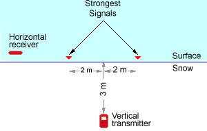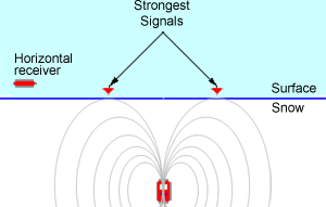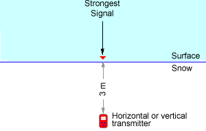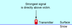 When the transmitting and receiving beacons are both on the surface of the snow, the receiving beacon will receive the strongest signal when it is directly above the transmitter (and the transceivers are almost touching). This is true regardless of the orientation of the two beacons and the number of antennas in the receiving beacon, because the transceivers are only a few inches from each other.