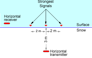However, when the transmitting beacon is buried, this can change significantly. As shown below, when the receiving beacon has fewer than three antennas and is held horizontally, and the transmitting beacon is buried three meters deep in a vertical orientation, the strongest signal will be a meter or two away rather than directly over the buried beacon.